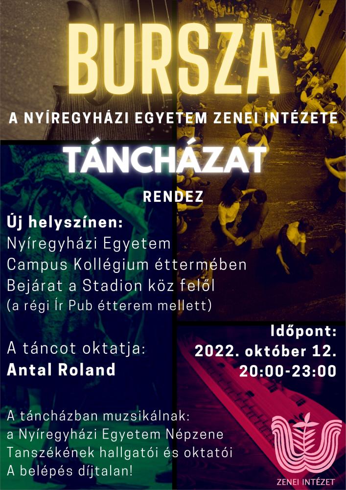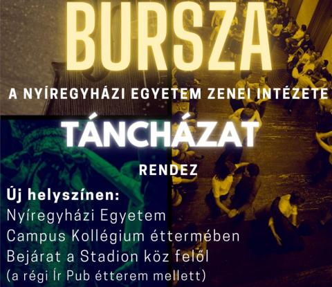A Nyíregyházi Egyetem Zenei Intézete Bursza Táncházat rendez. Helyszín: Nyíregyházi Egyetem Campus Kollégium étterme