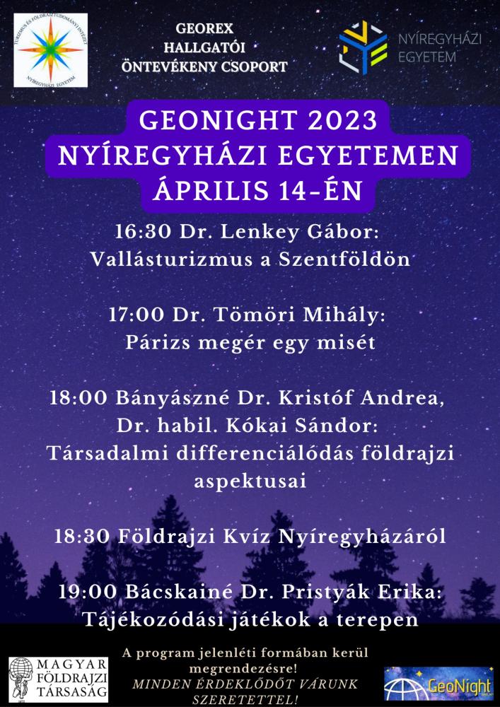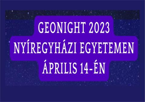 A Nyíregyházi Egyetem Turizmus és Földrajztudományi Intézetének szervezésében kerül megrendezésre 2023. április 14-én a Geonight 2023 című rendezvény. A program keretében 16:30-től kerül megrendezésre Dr. Lenkey Gábor: Vallásturizmus a Szentföldön; 17:00 órától Dr. Tömöri Mihály: Párizs megér egy misét; 18:00 órától Bányászné Dr. Kristóf Andra - Dr. habil. Kókai Sándor: Társadalmi differenciálódás földrajzi aspektusai című előadása. 18:30-től Nyíregyházáról szóló földrajzi kvízen vehetnek részt a jelenlévők. 19:00 órától Bácskainé Dr. Pristyák Erika: Tájékozódási játékok a terepen című programjára várják az érdeklődőket.
