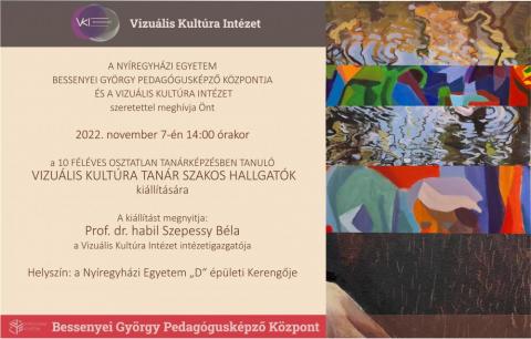 A Nyíregyházi Egyetem Bessenyei György Pedagógusképző Központja és a Vizuális Kultúra Intézet tisztelettel meghívja az érdeklődőket a 2022. november 7-én (hétfőn) 14:00 órakor tartandó, a 10 féléves osztatlan tanárképzésben tanuló VIZUÁLIS KULTÚRA TANÁR SZAKOS HALLGATÓK KIÁLLÍTÁSÁNAK megnyitójára.