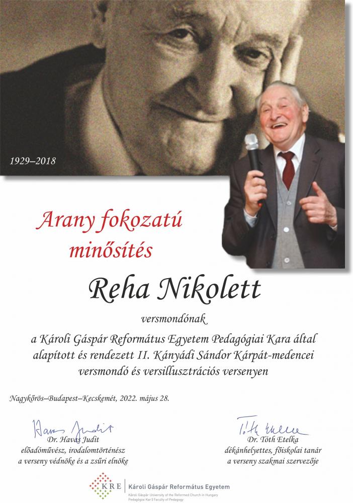 A Károli Gáspár Református Egyetemen május 28-án (ebben az évben már jelenléti formában) megrendezett II. Kányádi Sándor Kárpát-medencei versmondó versenyen Reha Nikolett, a Nyíregyházi Egyetem I. évfolyamos csecsemő- és kisgyermeknevelő szakos hallgató, arany fokozatot szerzett. A versenyen a hallgató Kányádi Sándor Valaki jár a fák hegyén és Tóth Krisztina Idő, idő, idő című versét mondta el. Felkészítő tanára: Tóthné dr. Szűcs Éva, az Óvó- és Tanítóképző Intézet oktatója.