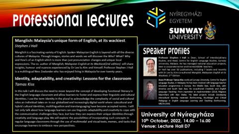 Ezúton meghívunk és invitálunk minden érdeklődőt 2022. október 10-én (hétfőn) 11:00 órától, illetve 14.00 óráról Dr. Kiss Tamás és Dr. Stephen Hall, a malajziai Sunway University két professzorának előadására. A programokra a Nyíregyházi Egyetem D7-es előadójában kerül sor.