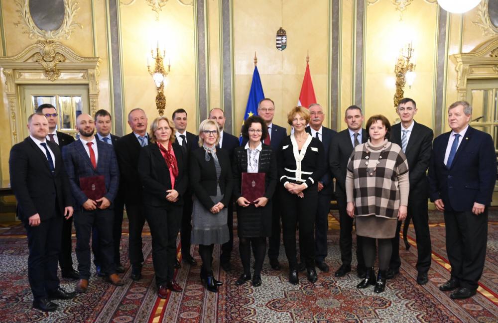 Fotó: Navracsics Tibor területfejlesztési miniszter illetve a megállapodást aláírt felsőoktatási intézmények képviselői. MTI/Bruzák Noémi