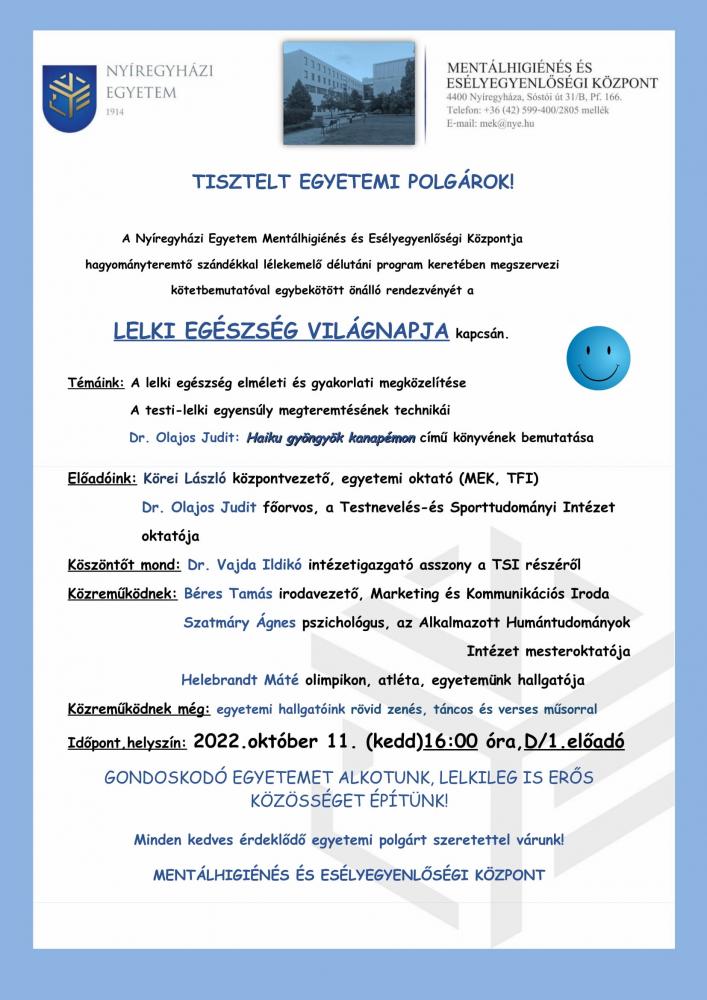 A LELKI EGÉSZSÉG VILÁGNAPJA alkalmából innovatív, a lelkekhez is szóló kezdeményezést indít útjára a Mentálhigiénés és Esélyegyenlőségi Központ. 2022. október 11-én kedden, 16:00 órától a Nyíregyházi Egyetem D/1.-es előadójában minden kedves érdeklődő egyetemi polgárt szeretettel várnak a Központ munkatársai és a meghívott előadók. Olyan egyedi, lélekemelő program lesz, amelyről távozva garantált a mentális felfrissülés - invitálnak az esemény meghívójában a szervezők.