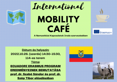 A Nemzetközi Kapcsolatok Iroda 2022. október 26-án (szerdán) 14:30 és 15:30 között International Mobility Cafét szervez. A tanév első eseményén a közelmúltban Ecuadorban járt oktatóink, Prof. dr. Szabó Sándor és prof. dr. Szép Tibor (magyar nyelvű) előadásukon szakmai tapasztalataikról, élményeikről beszélnek.