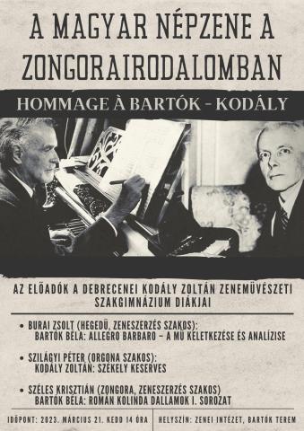 A magyar népzene a zongorairodalomban - Hommage á Bartók és Kodály címmel láthatnak előadásokat a Nyíregyházi Egyetem Zenei Intézetében 2023. március 21-én (kedden) 14:00 órától. Az előadók a debreceni Kodály Zoltán Zeneművészeti Szakgimnázium diákjai.