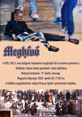 A Nyíregyházi Egyetem Vizuális Kultúra Intézet II. éves képi ábrázolás szakos hallgatóinak kiállítása 2023. május 4-ig megtekinthető a Kerengőben (D épület, földszint). A kiállítás címe: Raffaello: Athéni Iskola parafrázis.