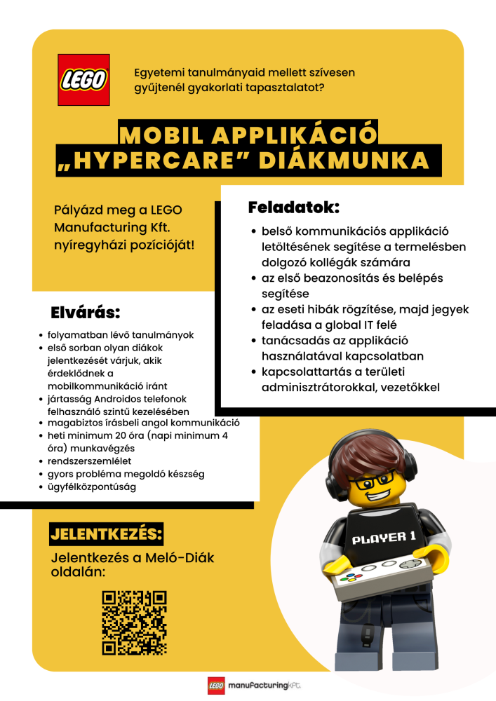 Egyetemi tanulmányaid mellett szívesen gyűjtenél gyakorlati tapasztalatot? Pályázd meg a LEGO Manufacturing Kft. nyíregyházi gyárának meghirdetett pozícióját, "Mobil applikáció >>HYPERCARE<< diákmunka területen!