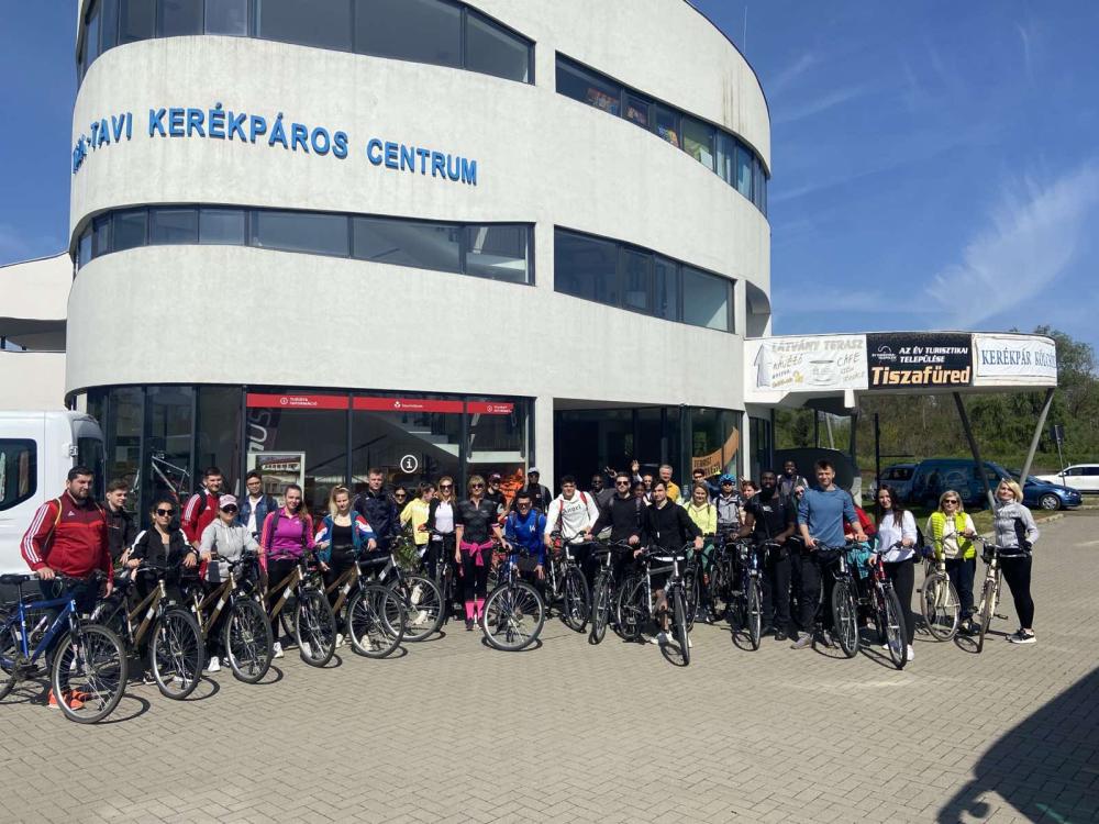 Április 28-án, pénteken az egyetemünk oktatói és hallgatói közös kerékpártúrán vehettek részt a Tisza-tó körül. A 36 lelkes és bátor résztvevő az egyetem előtti parkolóból indult útnak egy bérelt autóbusszal Tiszafüredre. 10.00 óra magasságában érkeztünk meg a Kerékpáros Centrumba, ahol jó minőségű, hadra fogható kerékpárok közül választhattak a résztvevők. Jakab-Keul Andrea, a Testnevelés és Sportudományi Intézet mesteroktatójának beszámolóját olvashatják.