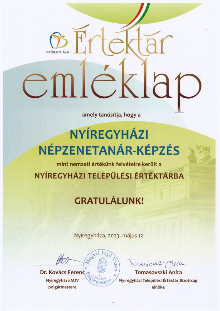 2023. május 12-én, ünnepélyes keretek között adta át Dr. Kovács Ferenc polgármester úr a Nyíregyházi Települési Értéktárba felvett „Nyíregyházi népzenetanár-képzés” elnevezésű nemzeti érték emléklapját az érték gondnokának és a Nyíregyházi Egyetem vezetőjének, Ferencziné dr. Ács Ildikó intézetigazgatónak és Dr. Szabó György rektornak.