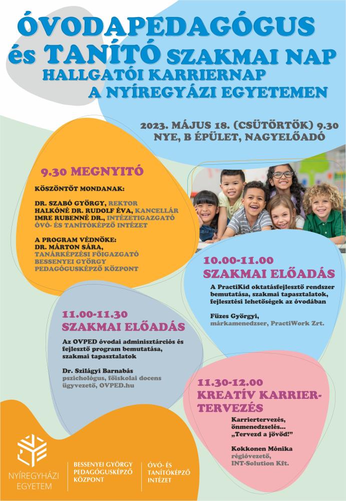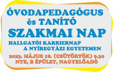 A Nyíregyházi Egyetem Bessenyei György Pedagógusképző Központja és az Óvó- és Tanítóképző Intézet 2023. május 18-án (csütörtökön) 9.30 órától az egyetem Nagyelőadótermében (B tanulmányi épület, földszint) Óvodapedagógus és Tanító Szakmai Napot szervez. A programra szeretettel invitálják az érdeklődőket.