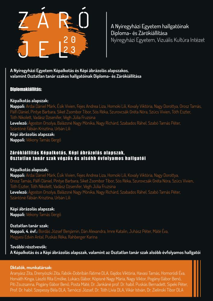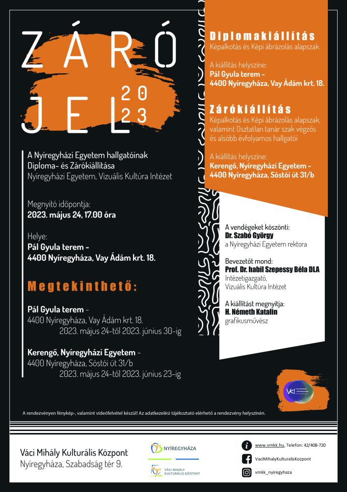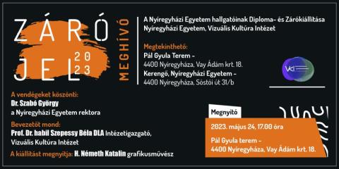 A Nyíregyházi Egyetem Vizuális Kultúra Intézet végzős hallgatóinak Diploma- és Zárókiállítása nyílik (az alsóbb évfolyamos hallgatók részvételével) 2023. május 24-én szerdán 17.00 órakor a Pál Gyula teremben. A vendégeket Dr. Szabó György, a Nyíregyházi Egyetem rektora köszönti, bevezetőt mond Prof. dr. habil. Szepessy Béla a Vizuális Kultúra Intézet igazgatója, a kiállítást megnyitja: H. Németh Katalin grafikusművész.