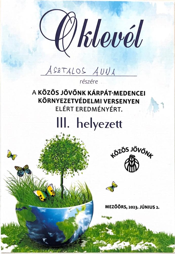 2023-ban ismét megrendezték a Közös Jövőnk Környezetvédelmi Versenyt Kárpát-medencei fiatalok számára, három korosztályban. A hallgatói korcsoportban a Nyíregyházi Egyetem mezőgazdasági mérnöki alapképzési szakos végzős hallgatója Asztalos Anna is megmérettette tudását „Környezetvédelmi technológiák-ökoinnovációk a Kárpát-medencében” című témában. Anna a verseny 2023. június 2-án Mezőörsön tartott országos döntőjében harmadik helyezést ért el.