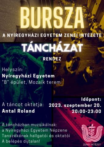 A Nyíregyházi Egyetem Zenei Intézete Bursza Táncházat rendez. Helyszín: Nyíregyházi Egyetem B épület, Mozaik terem. A táncot oktatja: Antal Roland. Időpont: 2023. szeptember 20. (szerda) 20:00-23:00. Muzsikálnak: a Nyíregyházi Egyetem Népzene Tanszékének hallgatói és oktatói. A belépés díjtalan!