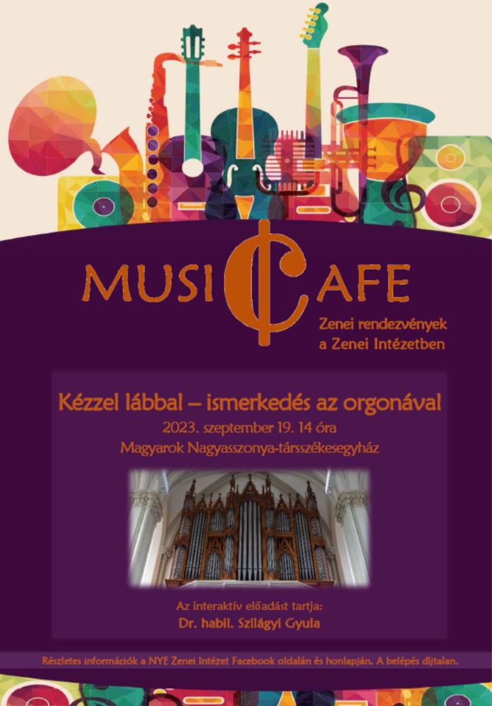 A Nyíregyházi Egyetem Zenei Intézetének Music Café című zenei rendezvénysorozata keretében 2023. szeptember 19-én (kedden) 14:00 órától tartják a Kézzel lábbal - ismerkedés az orgonával címmel Dr. habil. Szilágyi Gyula tart interaktív előadást a Magyarok Nagyasszony-társszékesegyházban.