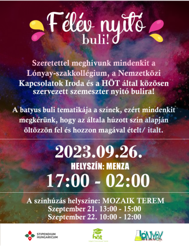 Szeretettel várnak mindenkit a szervezők a Lónyay Szakkoli, a Nemzetközi Kapcsolatok Iroda és a HÖT által szervezett félévnyitó bulin kedden.