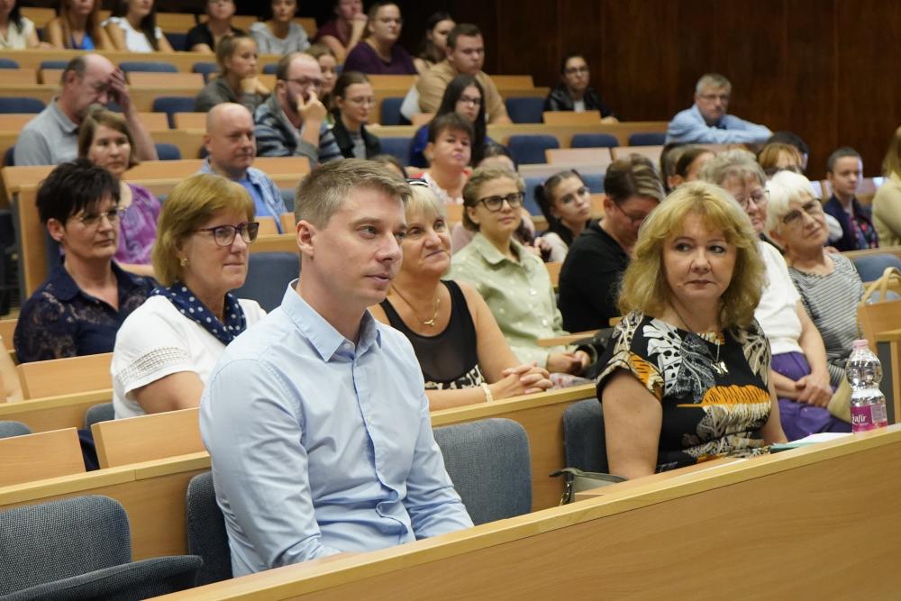 A házigazda szervező intézmény nevében Imre Rubenné dr. PhD, a Nyíregyházi Egyetem Óvó- és Tanítóképző Intézetének igazgatója köszöntötte a résztvevőket. – Öröm és megtiszteltetés, hogy ismét otthont adhatunk ennek a rangos szakmai konferenciának. Célunk továbbra is változatlan: a magyar népmese és műmese gazdag és egyedülálló világának őrzése, ápolása, népszerűsítése. Szeptember 30-án, Benedek Elek születésnapján van a magyar népmese napja. Benedek Elek nagyon sokat tett a mesék fennmaradásáért, népszerűsítéséért. Gazdag és egyedülálló a magyar mesevilág. A kultúrában és a társadalomban is különféle szerepet tölt be. Szórakoztató formája az irodalomnak, hagyományokat, értékeket, történeteket örökít meg. Tanulságokat, erkölcsi üzeneteket fogalmaznak meg a mesék. Vannak, akik hibákat követnek, a hősök pedig legyőzik a kihívásokat és az akadályokat. Az erkölcsi tanulságokat megértjük és alkalmazzuk a saját életünkben is – magyarázta Imre Rubenné dr. – A mesék segítik a képzelőerő fejlesztését, a konfliktusok és a megoldások a problémamegoldó képességet, a kreatív gondolkodást fejlesztik. A mesék erősítik az empátiát, elősegítik az azonosulást, vagyis segítik az emberi kapcsolatok fejlesztését, továbbá javítják a kommunikációs készségeket.