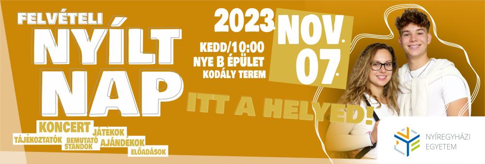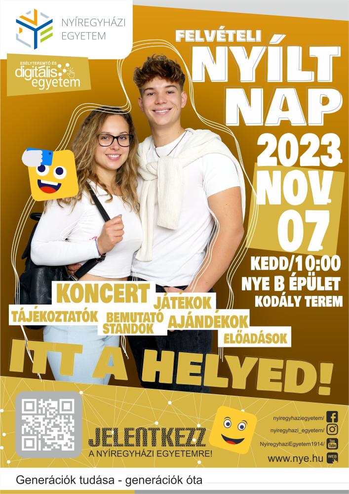 Kitárja ajtaját az egyetem. A Nyíregyházi Egyetem felvételi Nyílt Napra várja az érettségi előtt álló fiatalokat 2023. november 7-én (kedden) 10:00 órától. Még szinte alig telt el két hónap a szeptemberben megkezdődött tanévből, de már a jövő évi beiskolázásra készül a Nyíregyházi Egyetem. Természetesen ez érthető, hiszen az érettségi előtt álló középiskolás diákoknak nem könnyű eldönteniük, hogy hol is tanuljanak tovább. Meg kell ismerkedniük a képzési lehetőségekkel, az egyetemeken oktatott szakokkal, ugyanakkor jól kell ismerniük önmagukat is. A döntés megkönnyítése érdekében rendez nyílt napot a Nyíregyházi Egyetem november 7-én (kedden) 10:00 órától a B épület, Kodály-termében. A nyílt nap fontosságáról és tartalmi részleteiről tartottak sajtótájékoztatót az oktatási intézmény vezetői - számol be a szon.hu portál.