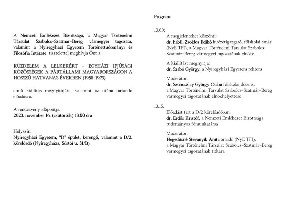 A Nemzeti Emlékezet Bizottsága, a Magyar Történelmi Társulat Sz-Sz-B vármegyei tagozata, valamint a Nyíregyházi Egyetem Történettudományi és Filozófia Intézete tisztelettel meghívja az érdeklődőket a Küzdelem a lelkekért - egyházi ifjúsági közösségek a pártállami Magyarországon a hosszú hatvanas években (1958-1973) című kiállítás megnyitójára és az utána tartandó előadásra. A rendezvény időpontja: 2023. november 16. (csütörtök) 13:00, helyszíne: NyE, D épület kerengő (kiállítás) / NyE D/2-es körelőadó (előadások).