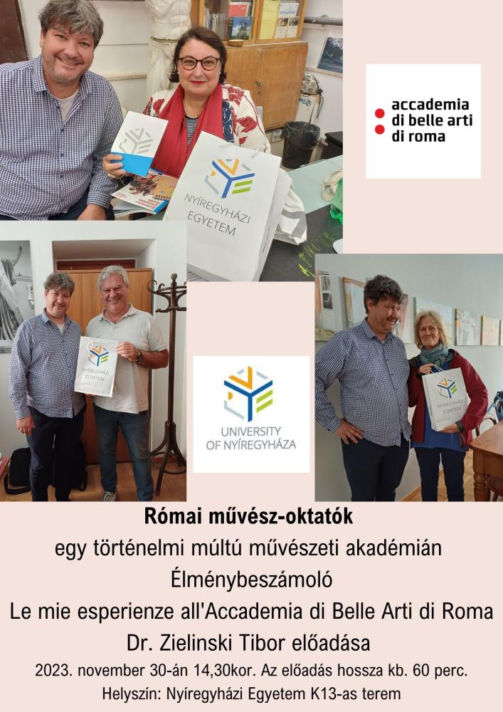 2023. november 30-án 14:30-kor élménybeszámoló előadást tart Dr. Zielinski Tibor, a Nyíregyházi Egyetem Vizuális Kultúra Intézetének oktatója Római művész-oktatók egy történelmi múltú művészeti akadémián címmel. Helyszín: Nyíregyházi Egyetem, K13-as terem. A programra minden érdeklődőt szeretettel várunk.