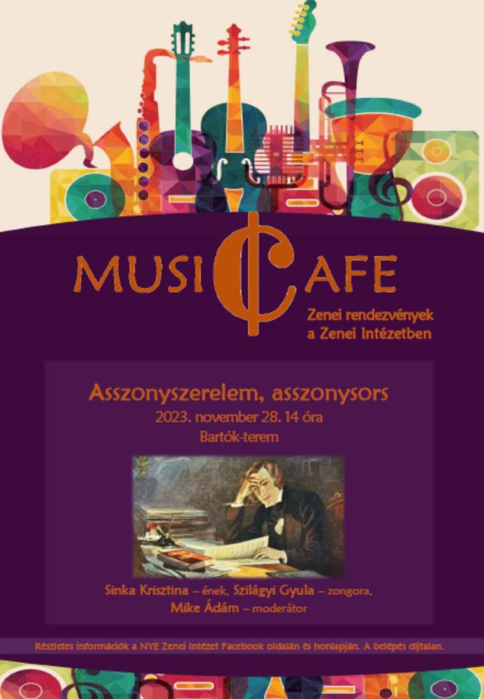 Asszonyszerelem, asszonysors címmel tartja következő zenei programját a Zenei Intézet a a MusiCafé (zenei rendezvények a Zenei Intézetben) programsorozat keretében 2023. november 28-án (kedden) az intézmény Bartók termében. Közreműködik Sinka Krisztina (ének), Szilágyi Gyula (zongora), moderátor: Mike Ádám.