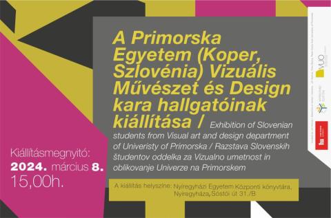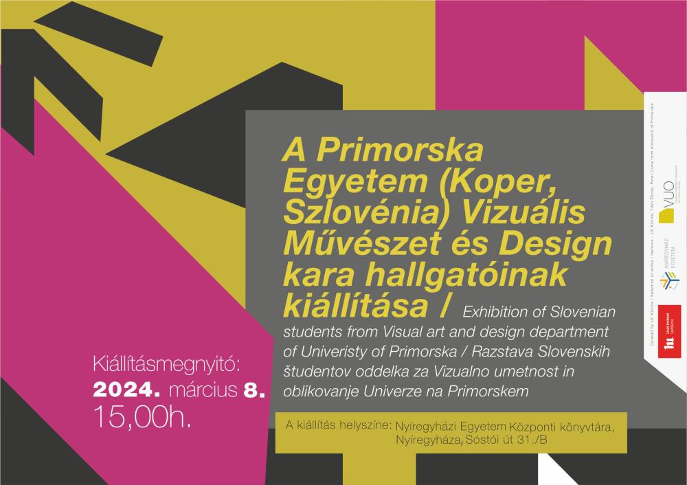 A Primorska Egyetem (Koper, Szlovénia) Vizuális Művészet és Design kara hallgatóinak munkából rendeznek kiállítást a Nyíregyházi Egyetemen. Az esemény megnyitójára 2024. március 8-án (pénteken) 15:00 órától kerül sor az intézmény Központi Könyvtárának kiállítótermében (4400 Nyíregyháza, Sóstói út 31/B, B épület, földszint). A megnyitó díszvendége: Őexcellenciája Dr. Marjan Cencen, a Szlovén Köztársaság nagykövete. A kiállítást megnyitja prof. Jiri Kocica, egyetemi oktató, szobrászművész (University of Primorska Faculty of Visual Arts and Design) és Dr. Zielinski Tibor DLA adjunktus, szobrászművész (Nyíregyházi Egyetem Vizuális Kultúra Intézet).