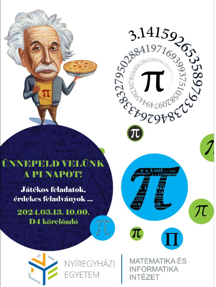 A nemzetközi π-napot (3. hó 14-ét) egyre szélesebb körben világszerte különböző rendezvényekkel, vetélkedőkkel és konferenciákkal ünneplik. A Nyíregyházi Egyetem Matematika és Informatika Intézete 2022 márciusában csatlakozott ehhez a nemes kezdeményezéshez. 2024. március 13-án 10 órától π-nap-i matematikaversenyt szerveznek a középiskolás diákok számára az egyetem D4. körelőadójában. A szervezők célja, hogy népszerűsítsék a matematikát és az intézményen folyó képzéseket, szakmai munkát.