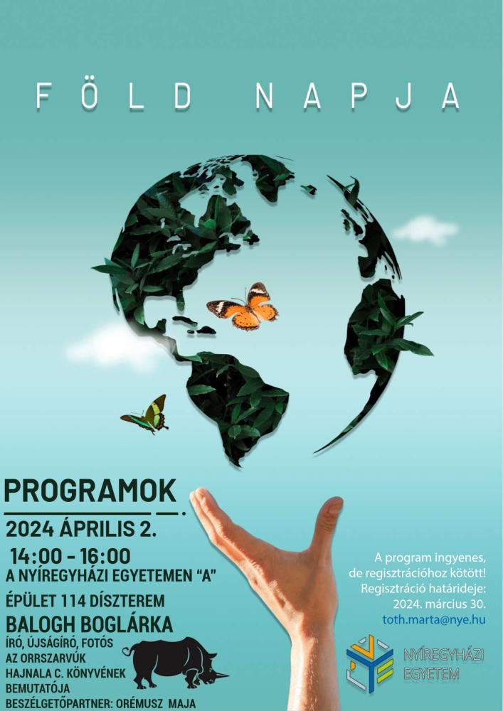 A Nyíregyházi Egyetem Környezettudományi Intézete szervezésében a Föld Napja alkalmából, 2024. április 2-án, kedden, 14:00-16:00 óra között, az "A" épület A114-es dísztermében (1. emelet) kerül sor Balogh Boglárka (író, újságíró, fotós): Az orrszarvúk hajnala című könyvének bemutatójára. Beszélgetőpartner: Orémusz Maja. Az eseményre szeretettel várunk minden érdeklődőt.