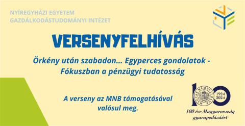 Az MNB támogatásával a Nyíregyházi Egyetem Gazdálkodástudományi Intézete pénzügyi versenyt hirdet, melynek témája: „Örkény után szabadon… Egyperces gondolatok - Fókuszban a pénzügyi tudatosság”. A verseny célja: Az egyetemi oktatásban a pénzügyi és a vállalkozási ismeretek átadása rendkívül fontos, nélkülözhetetlen része a hallgatók szakmai fejlődésének. Ezt felismerve, kísérleti jelleggel, első alkalommal kerül megrendezésre a pénzügyi témájú verseny, melynek célja a pénzügyi tudatosság fejlesztése a fiatalok körében. Intézetünk kiemelt célja, hogy a hallgatók számára élményalapú módon tegye vonzóvá a pénzügyi és vállalkozói témákat. Mai, modern köntösben, a fiatalok igényeihez igazodva vennénk górcső alá a pénzügy sokszínű világát.