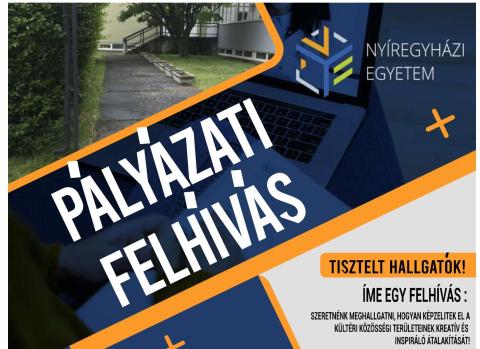 Arra vagyunk kíváncsiak, hogy Ti, egyetemi hallgatók hogyan képzelitek el a Nyíregyházi Egyetem kültéri közösségi tereinek fejlesztését, megújítását. Pályzati felhívásunk keretében várjuk kreatív, inspiráló ötleteiteket, 2024. május 6-ig a toth.marta(kukac)nye.hu címre. Részletes felhívást az alábbi plakáton olvashatjátok...