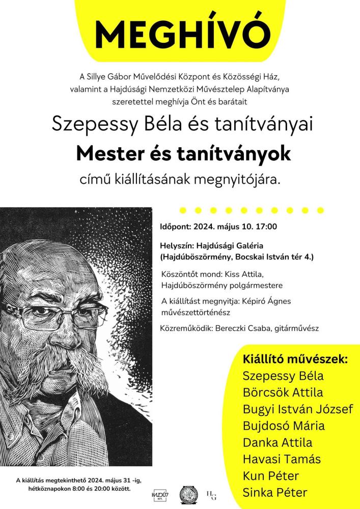 A Sillye Gábor Művelődési Központ és Közösségi Ház, valamint a Hajdúsági Nemzetközi Művésztelep Alapítványa tisztelettel meghívja az érdeklődőket Szepessy Béla, szobrászművész, a Nyíregyházi Egyetem intézetigazgatója - és tanítványai munkáiból rendezett Mester és tanítványok című kiállítására. Az esemény megnyitójára május 10-én 17:00 órától kerül sor a Hajdúsági Galériában. Köszöntőt mond Kiss Attila Hajdúböszörmény polgármestere, megnyitó beszédet mond Képíró Ágnes művészettörténész, közreműködik Bereczki Csaba gitárművész. A kiállítás megtekinthető május 30-ig.