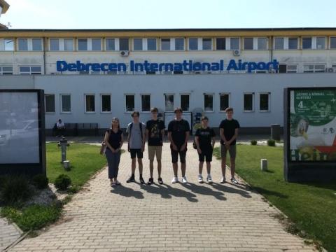 Az Eötvös Gyakorlóiskola 10. évfolyamos „repülős” fakultációs csoportja a Debreceni Nemzetközi repülőtér előtt