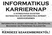 A Matematika és Informatika Intézet május 22-én délelőtt az egyetem D7 körelőadójában Informatikai Karriernapot rendezett hallgatói számára. A mérnökinformatikus és programtervező informatikus alapszakos hallgatók mellett a felsőoktatási szakképzésben résztvevő diákok is aktív részesei voltak az eseménynek. A szervezők célja az volt, hogy az érdeklődők képet kapjanak arról, hogy milyen munkakörök vannak egy nagyobb informatikai fejlesztő cégnél, hogyan telik egy backendes/frontendes/tesztelő/devOps-os egy napja, "sprint"-je", milyen egy közös projektmunka.