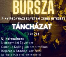 A Nyíregyházi Egyetem Zenei Intézete Bursza Táncházat rendez. Helyszín: Nyíregyházi Egyetem Campus Kollégium étterme. A táncot oktatja: Antal Roland. Időpont: 2023. április 12. (szerda) 20:00-23:00. Muzsikálnak: a Nyíregyházi Egyetem Népzene Tanszékének hallgatói és oktatói. A belépés díjtalan!